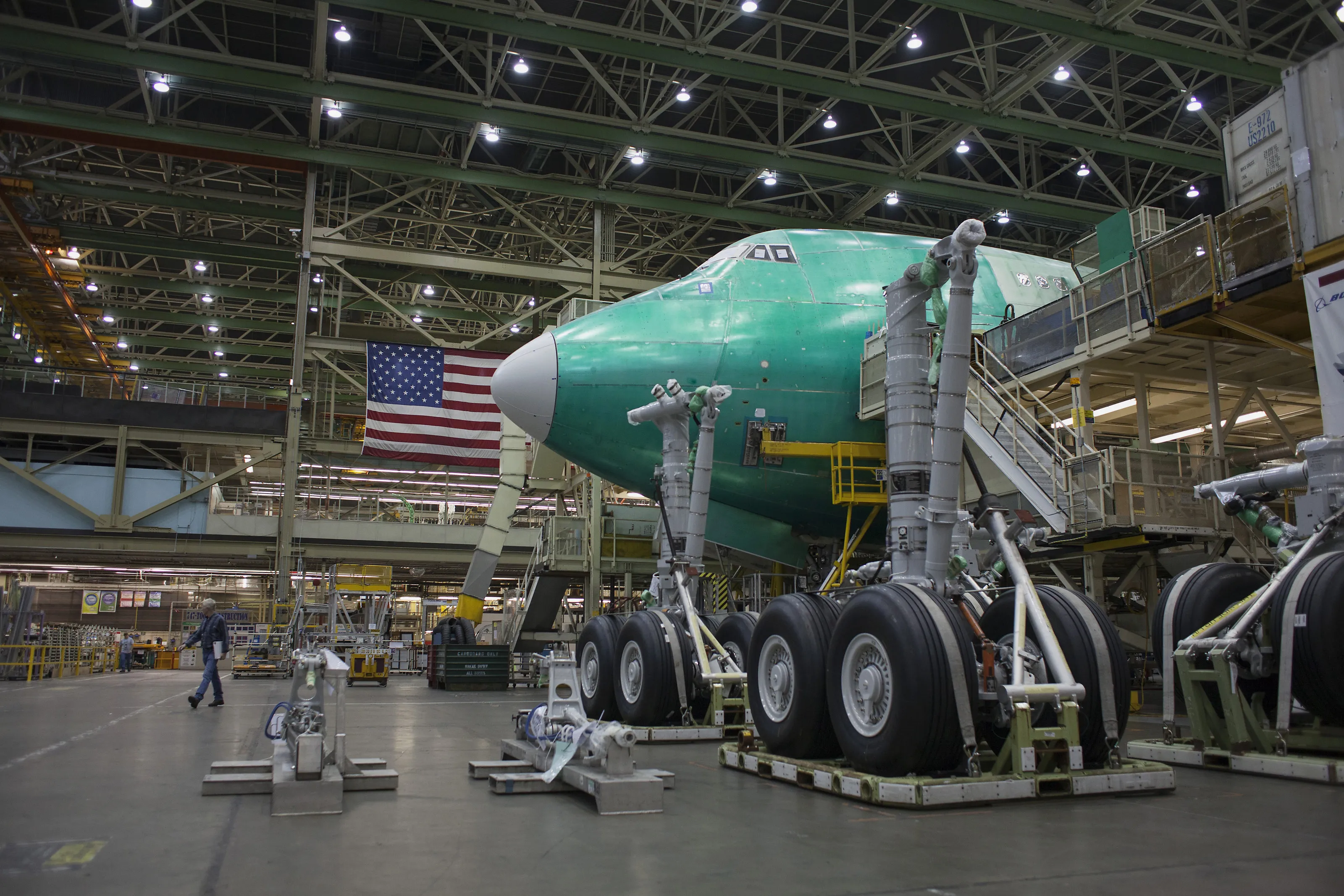 摄影师:David Ryder/Bloomberg波音747-8,美国飞机制造商的最新型号,在2014年3月31日于华盛顿州西雅图附近的工厂建造。