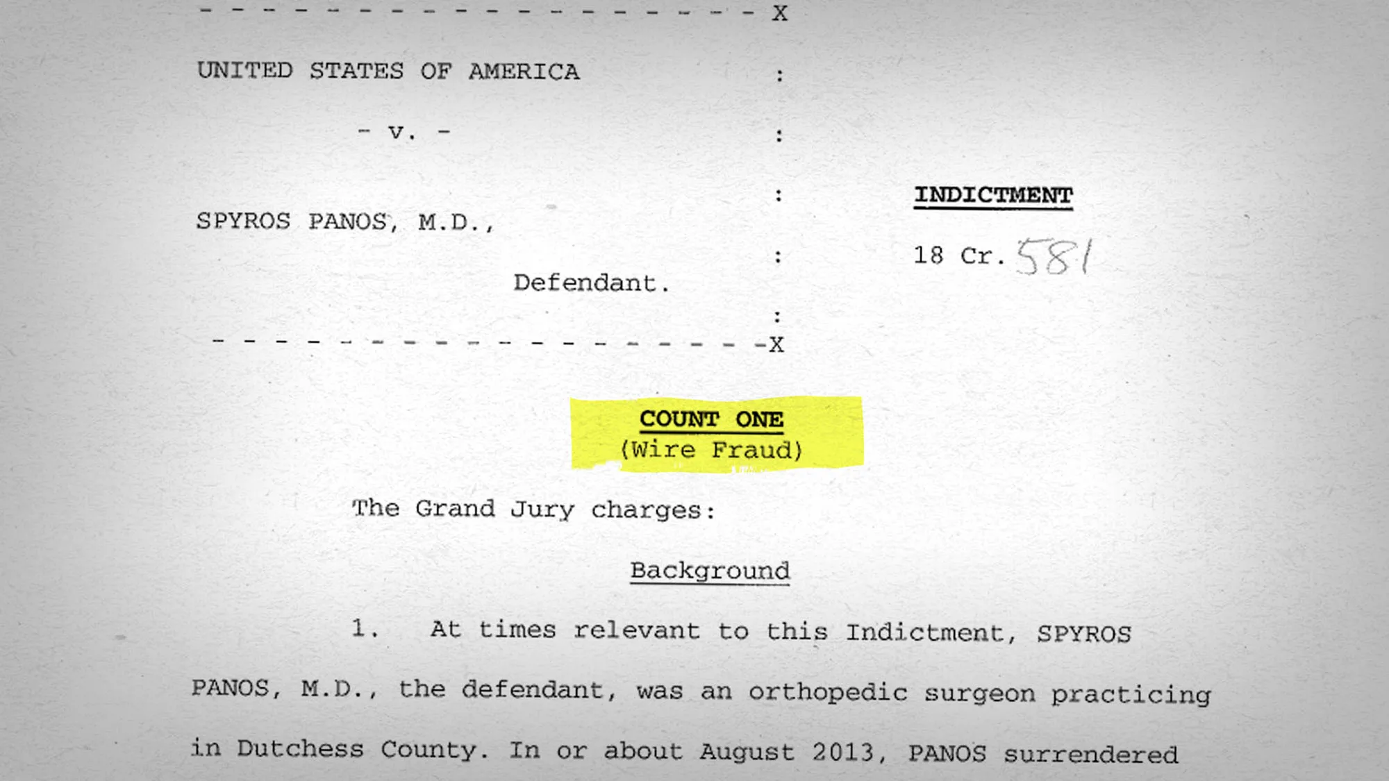 这一阴谋始于2010年,当时纽约州医疗当局要求提供Panos四名患者的记录。根据他的判刑备忘录,Panos伪造医疗记录以掩盖自己的行踪,使患者“处于不知道Panos实际上对他们进行了哪些手术的境地。”