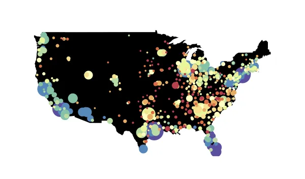 全国流感强度的地图。蓝色和紫色代表较低强度;红色和橙色则代表较高强度。点的大小根据人口规模增加。感谢本杰明·达尔齐尔和《科学》杂志研究的作者之一,俄勒冈州立大学的本杰明·达尔齐尔表示,结果是“违反直觉的”——毕竟,在工作日的市中心和拥挤的火车上,人们聚集在大城市,不会更容易爆发流感吗?