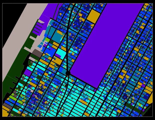 当一个可步行的城市通过土地使用进行映射时,图像显得截然不同。如果上面的图片是罗斯科,那么下面的就是塞拉,后者是点彩派画家。用途仍然是分开的,但颗粒更细,就像五彩纸屑。而这个计划的大部分区域,用红色标出,包含了多种用途的建筑,垂直混合。