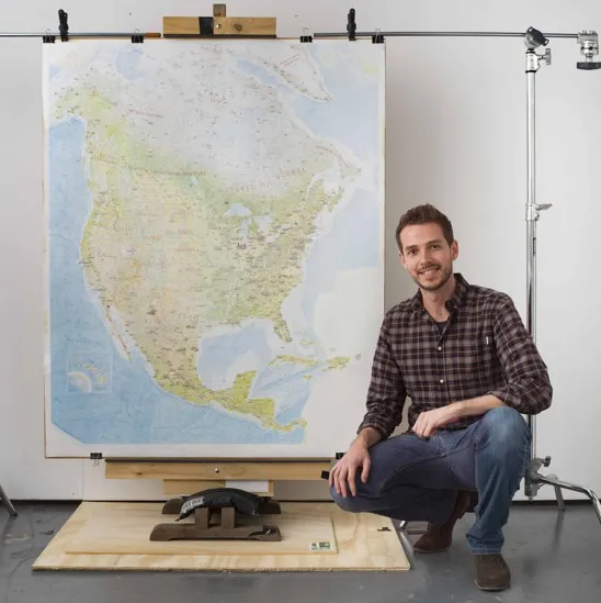 托马斯在2018年8月与他几乎完成的北美手绘地图。安东·托马斯托马斯是一位出生于新西兰、现居墨尔本的艺术家和制图师,自2014年以来一直在绘制一幅巨大的北美图示地图。正好赶上北美制图信息协会的下周在弗吉尼亚州诺福克的年会,托马斯几乎完成了他这一宏伟且完全自我指定的任务。他也是自学成才;托马斯在开始绘制美国、墨西哥和加拿大的州、市、山脉和河流之前几乎没有使用过彩色铅笔——加上周围海洋的水深测量——充满了丰富的情感。