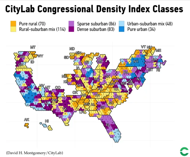上周在CityLab,我的同事大卫·蒙哥马利和理查德·弗洛里达报道了一篇充满视觉效果的故事,关于即将到来的中期选举中的郊区摇摆因素。他们展示了值得关注的地区:在密集和稀疏人口的郊区——故事中仔细定义的地理——“几乎40%的共和党席位是有竞争力的,”他们写道。