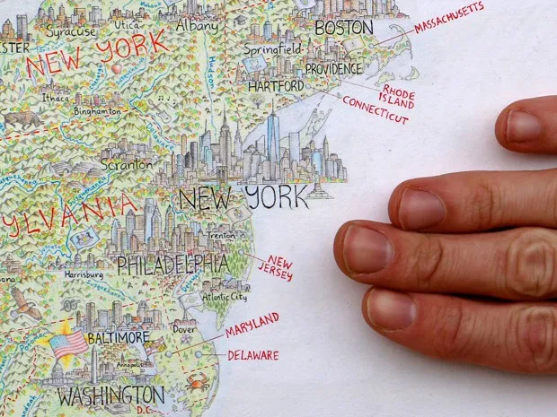 纽约市到华盛顿特区走廊的特写。安东·托马斯托马斯无法确切说出是什么激励了他。但他告诉我,这一切始于一个冲动:2012年,他和室友在蒙特利尔的街上捡到一台旧冰箱,他随意地在上面画出了北美的轮廓。托马斯直到最近还靠经营一所高中的印刷室为生,他非常享受这个任务,以至于决定在接下来的几年里几乎将所有的空闲时间都投入到做好这件事上。一旦他下个月完成这幅地图,他将写一本关于这个项目的书,然后开始他的下一个边界,一幅世界动物地图。