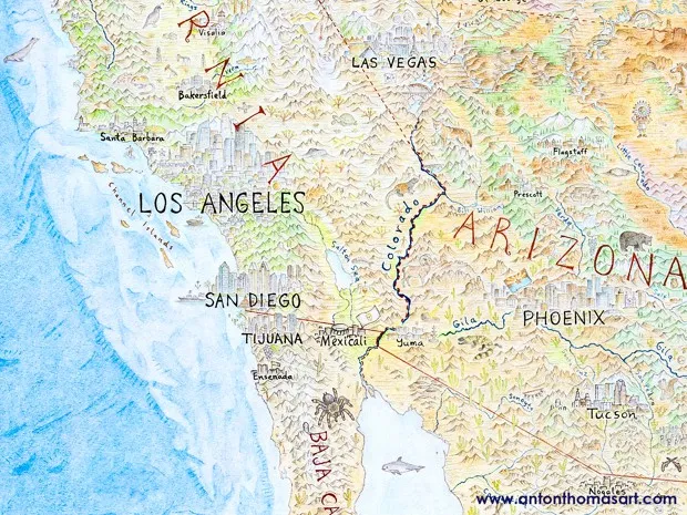 南加州和西南部部分地区的特写。安东·托马斯制作这张地图改变了你在北美旅行的体验吗?