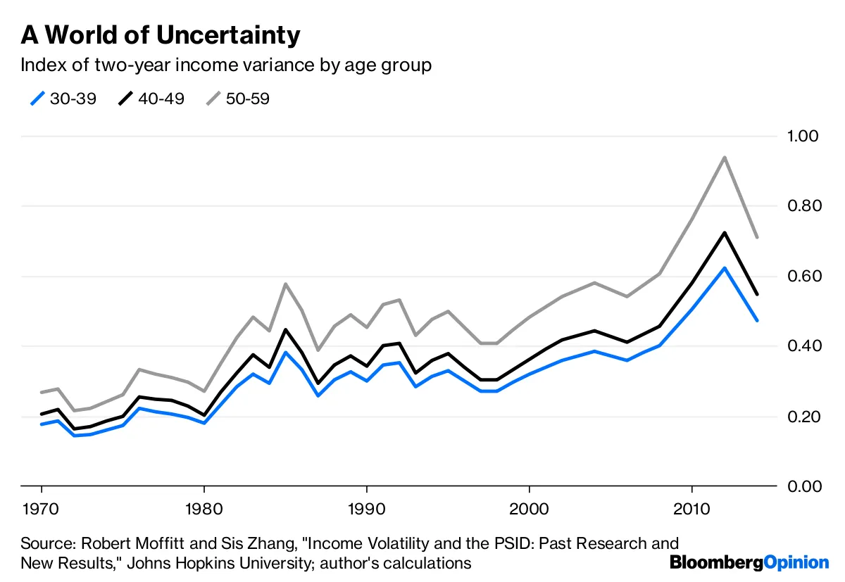 这个图表显示的是收入波动性——缺乏可靠、稳定的薪水——在 几十年里一直在上升。它在金融危机后经历了一次特别严重的激增,但远未回到20年前的水平。这导致了收入增长乏力和那种普遍的不安感,帮助特朗普进入白宫。阅读 整个内容。