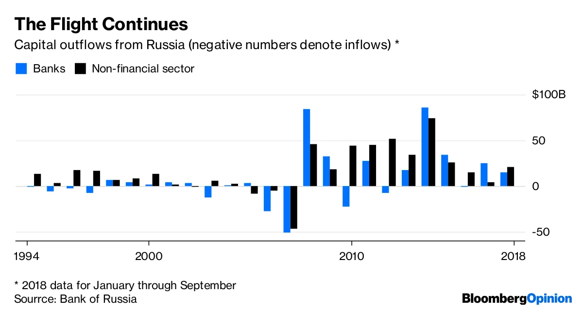 这张图表是弗拉基米尔·普京需要俄罗斯人将 海外资金带回家的一个重要原因。但他显然没有让这变得吸引人,写道 列昂尼德·贝尔希茨基。