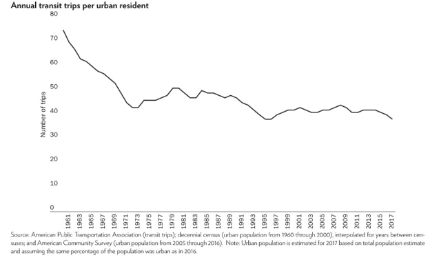奥图尔以一系列统计要点开场,记录了公共交通的死亡螺旋。他抓住了最新的全国公共交通乘客数据,但他的消息是典型的奥图尔:政府对公共汽车、火车、轻轨和电车的资金支持失败,应该停止。“我对公共交通行业的未来基本上持悲观态度,”奥图尔说。“公共交通乘客人数一直在稳步下降,所有主要城市地区都在下降,无论是铁路还是公交。我看不到恢复的希望,因为导致其下降的力量并没有消失。”