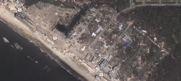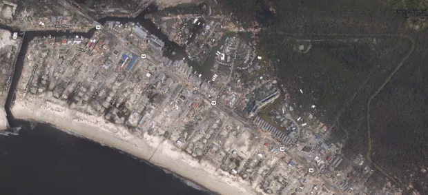 但迈克尔并没有对这段海岸线上的每个地方造成同样的伤害。NOAA的图像显示其他地方或多或少保持完好。佛罗里达州拥有全国 最严格的建筑规范,按照其标准建造的建筑物在抵御如此猛烈的风暴时更有可能幸存。
