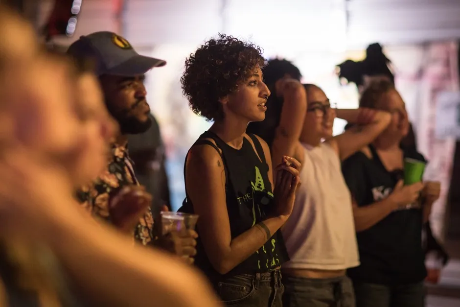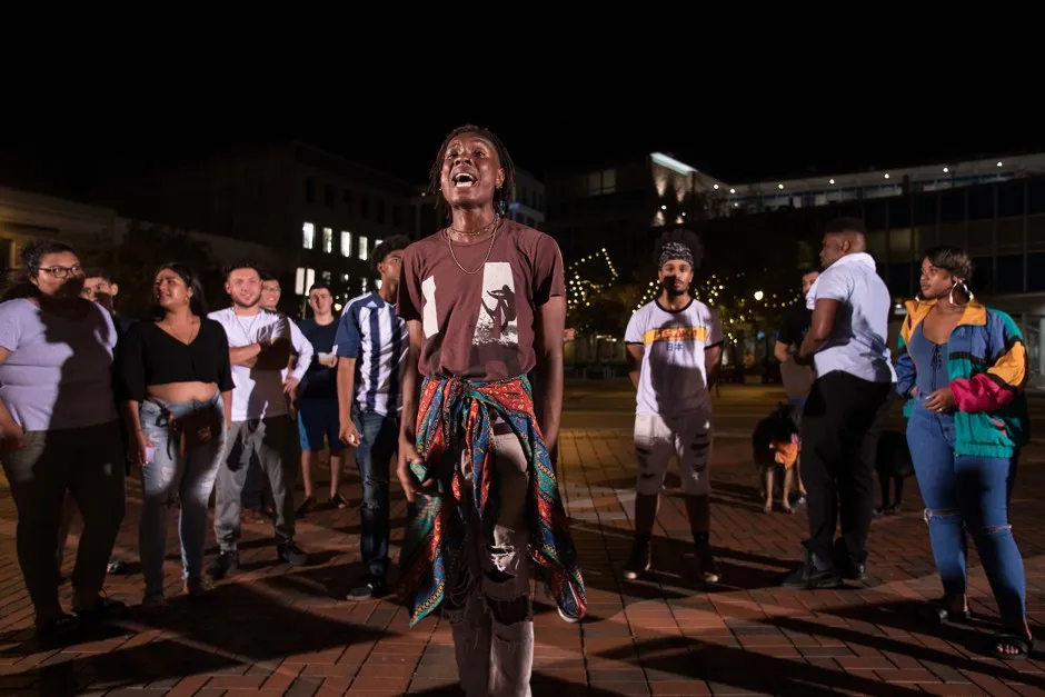 七分钟后,孩子们开始表演他们的诗歌,许多诗歌都是关于年轻黑人男性被警察枪击的。这一过程和这些材料将为后续的即兴表演提供动力。“我从来没有勇气在别人面前表演,”19岁的阿莉莎·古尔内尔说,她已经写了多年的诗。在参加Blackspace的课程后,她现在在CCB广场进行说唱。