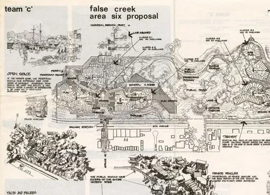 假溪区六号提案,C组(汤普森、贝尔维克、普拉特及合伙人),1974年。温哥华市,档案馆,PD158。上述图像描绘了一个理想家庭社区的部分设计,依据评论家亚历山德拉·朗格的说法。她在她的新书中强调了温哥华的发展,儿童设计。