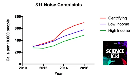 该节目的制片人之一,梅瑞尔·霍恩,她拥有加利福尼亚大学旧金山分校的神经科学博士学位,分析了超过600,000个311电话的数据,时间跨度为6年。利用城市开放数据门户提供的311数据,她和她的团队绘制了纽约市41个普查区的人均噪音投诉——如敲打声、响亮的音乐和大声谈话。然后,使用 纽约大学的Furman中心采用的方法,团队确定了2011年至2016年间绅士化的社区。(想想:贝德福德-斯图伊维森特、皇冠高地、布什维克和弗拉特布什。)在通过统计测试进行分析后,他们发现了一些重要的事情:所有社区的人均311电话都有所增加,但在绅士化的社区中,增长速度快了70%。