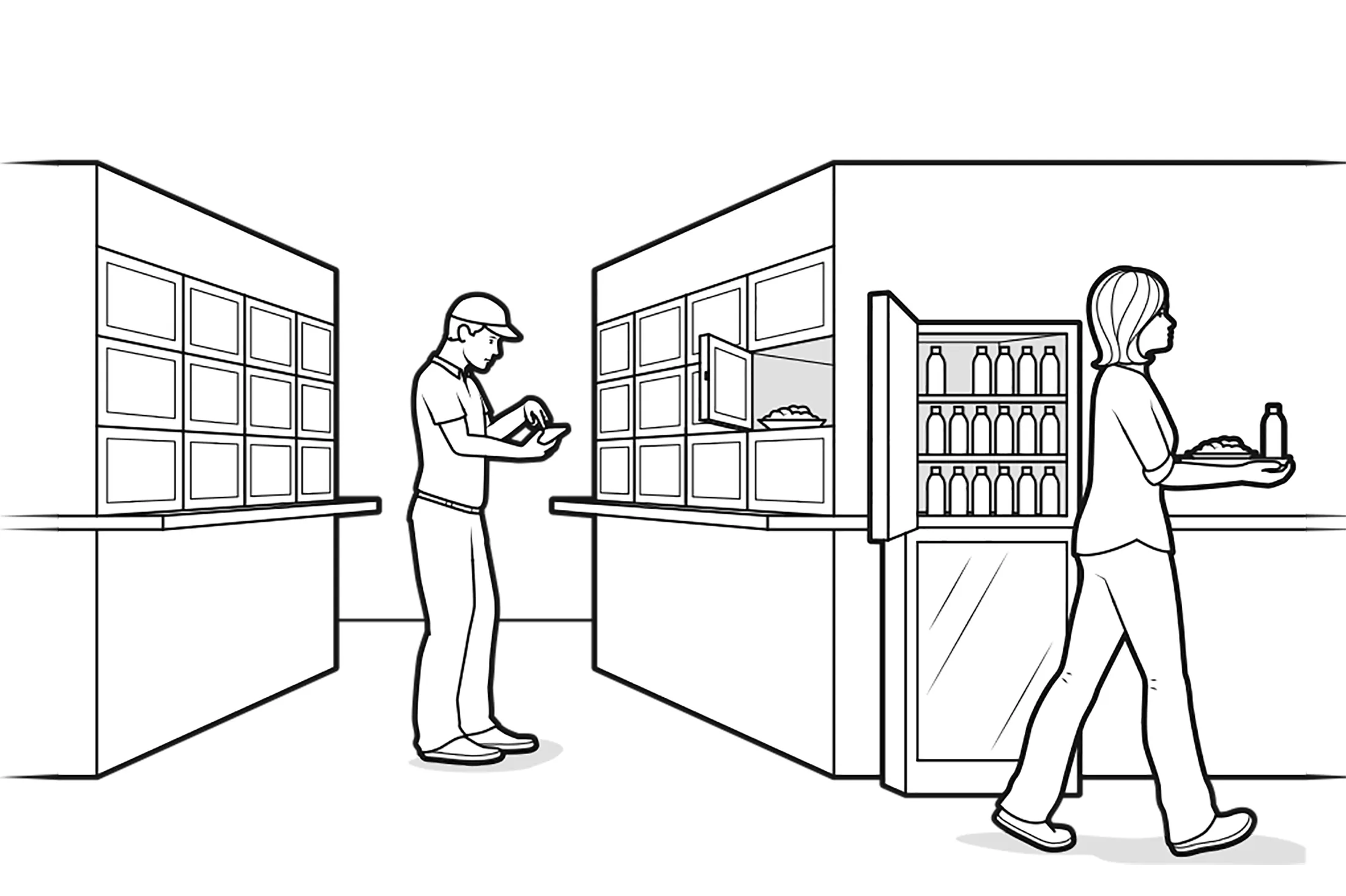 当他的食物准备好时,顾客会在手机上收到一个带有储物柜号码的通知。当他走近时,储物柜会自动打开。
