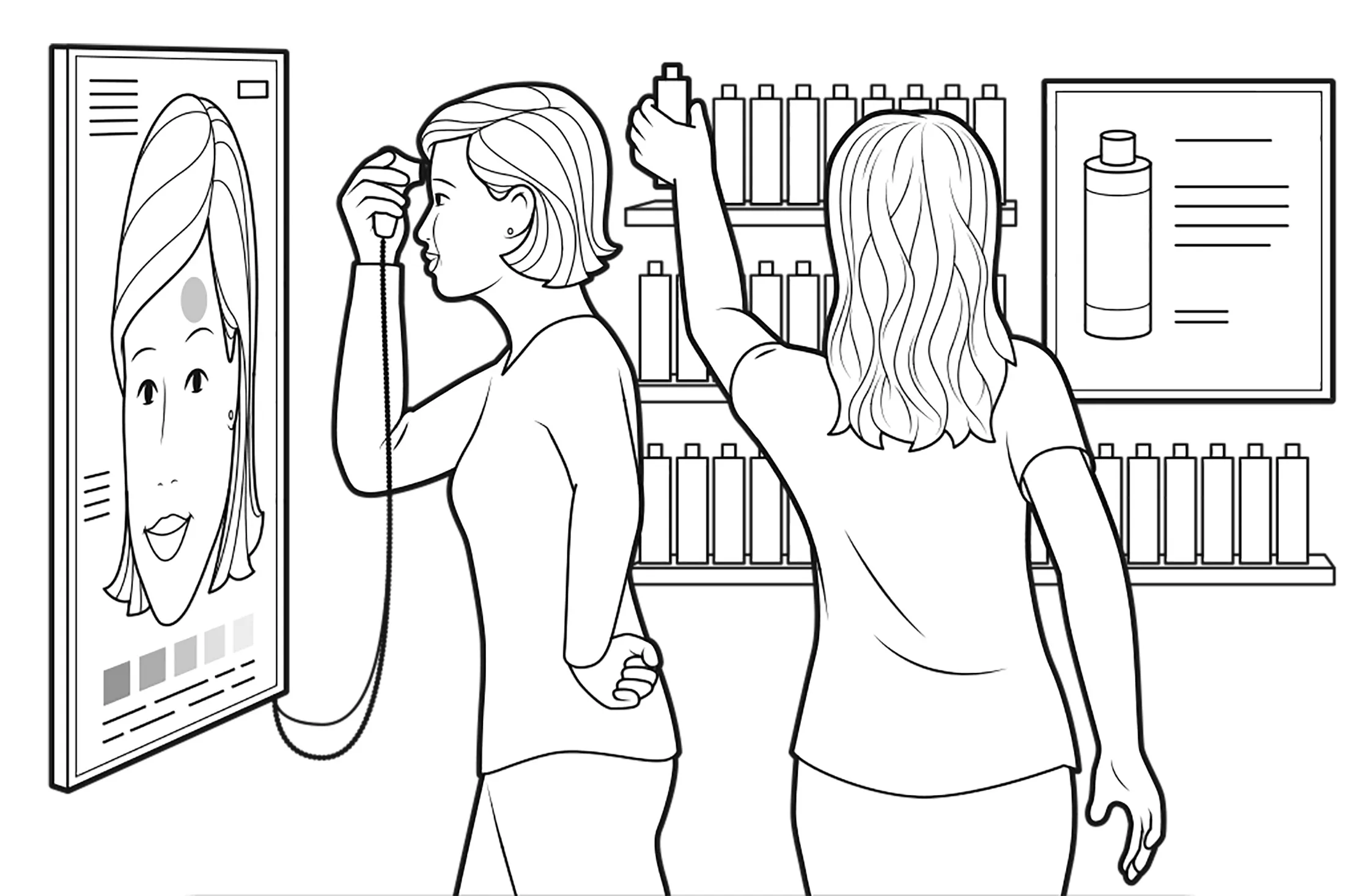 阿里巴巴在杭州的一家商店中为韩国品牌Innisfree的美容产品配备了使用增强现实技术的“魔法”镜子,顾客可以虚拟试用不同色调的口红或眼影。顾客用附带的魔杖在脸上挥动;镜子根据她的皮肤湿度、色素沉着和皱纹的读数显示推荐产品。如果顾客从智能货架上拿起一瓶保湿霜,产品信息会自动出现在旁边的屏幕上。