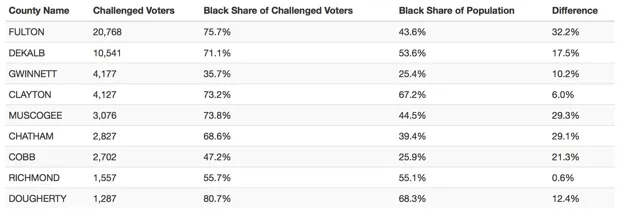 其他五个选民注册被冻结的县位于亚特兰大的郊区,其中四个县在全州待处理选民注册的总数中名列前茅。在这十个县中,除了两个县外,属于非裔美国人的待处理选民注册的比例大于这些县中非裔人口的比例。