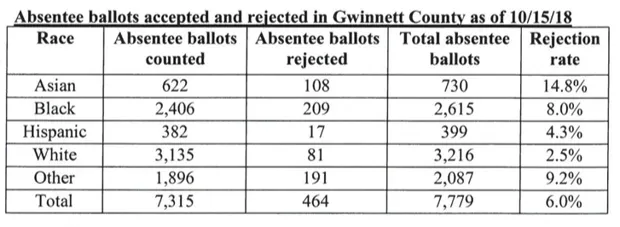 格温内特县是这场比赛中值得关注的地方,因为它是几个可疑选举政策的中心,这些政策听起来很像选民压制。它不仅在所有县中拥有第三高的暂停选民登记数量,还拥有全州最高的缺席选票拒绝率。事实上,仅格温内特县就占乔治亚州被拒绝缺席选票总数的40%。而且,与被冻结的选民登记一样,受影响的主要是有色人种——8%的非裔美国人的缺席选票和近15%的亚裔美国人的缺席选票被拒绝,而白人的缺席选票被退回的比例仅为2.5%。