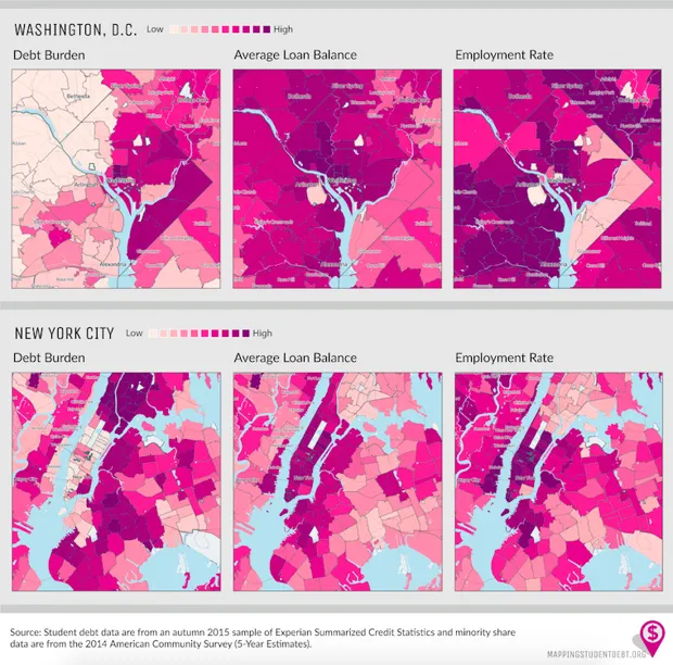 研究人员发现,债务负担在像华盛顿特区东南部这样的社区中最高,那里的就业率较低,这表明学生债务危机与劳动市场的健康密切相关。债务负担较低的地区往往有更高的平均贷款余额,例如在曼哈顿,这表明那些承担更多学生贷款的人已经具备更强的财务稳定性,或者在毕业后更容易获得高薪工作。但与“进步一代”合作的罗斯福研究所研究主任马歇尔·斯坦鲍姆认为,这些地理差异不仅仅是由于更高的薪水,还与城市内部明显的种族和收入隔离有关。
