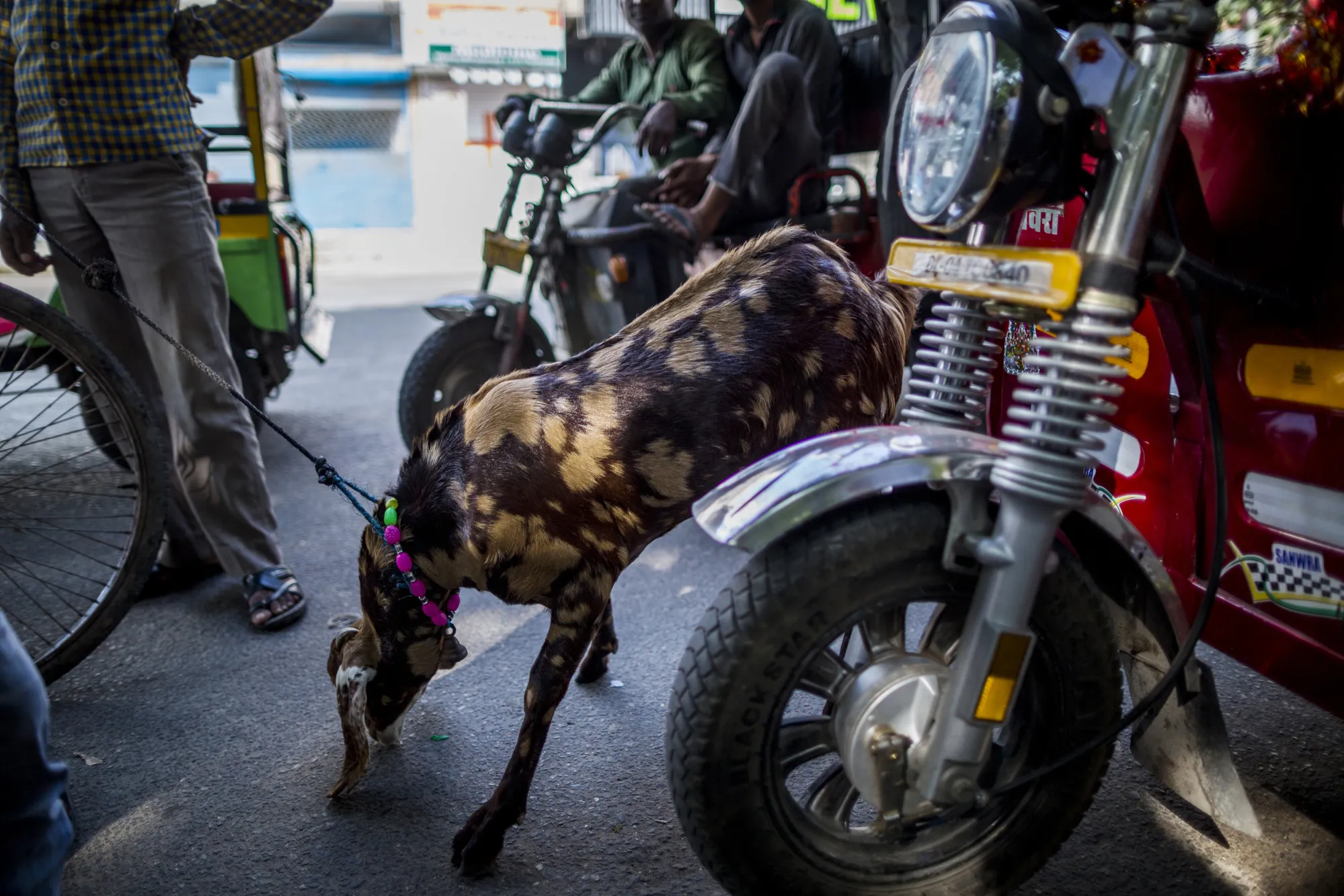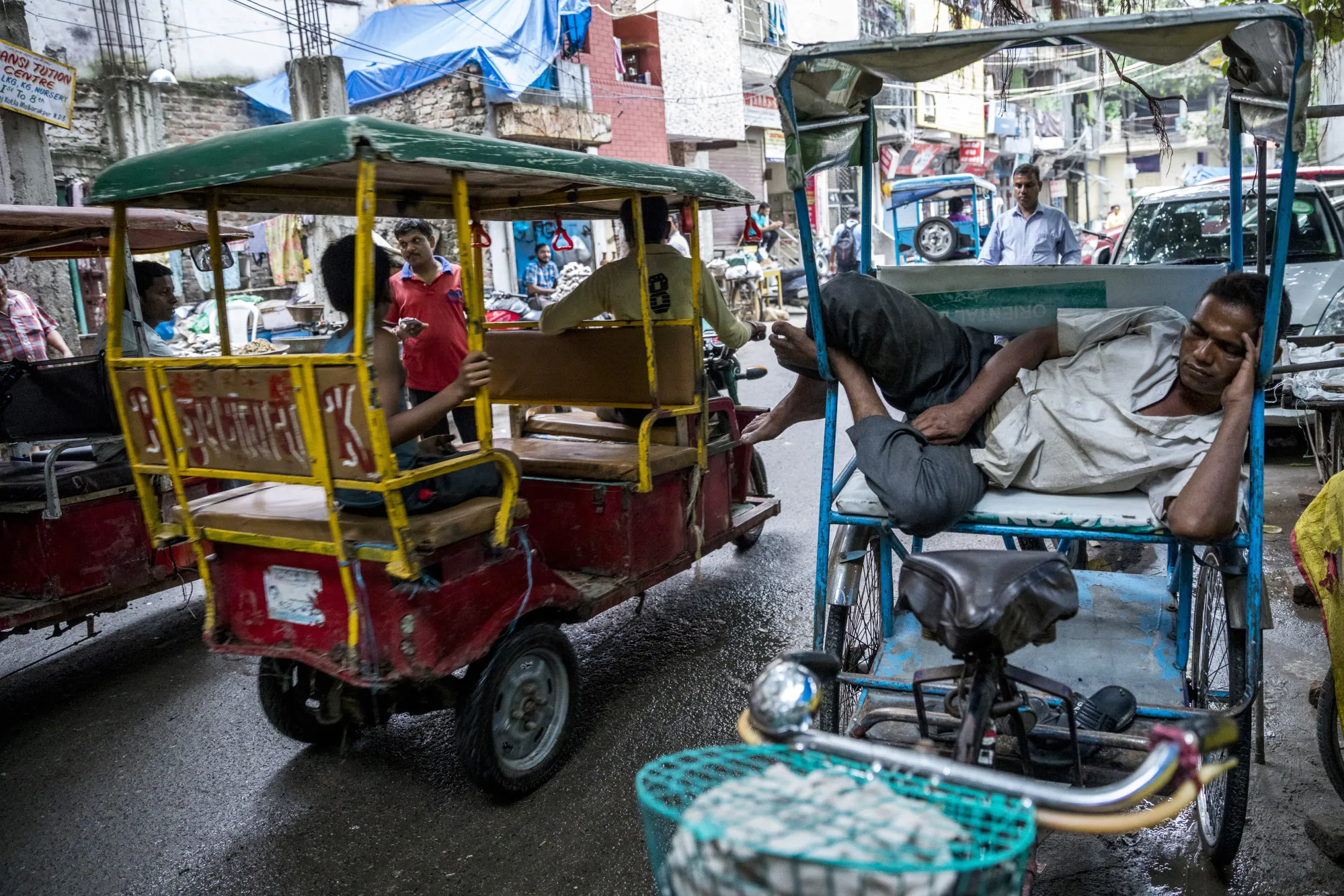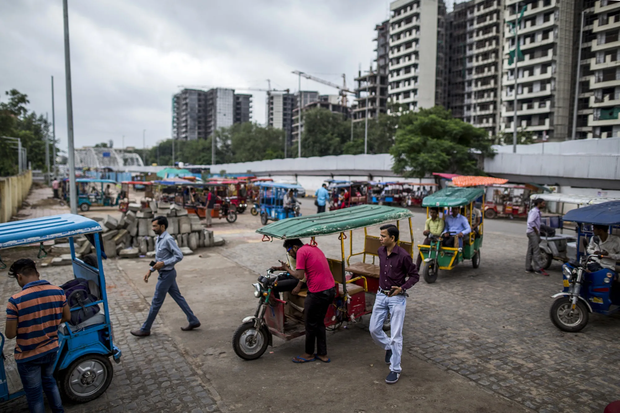 在东德里的一座地铁站外,一排部分开放的车辆停在街道上,通勤者们在招呼他们的车辆。它们还载着游客、学生、水果箱和偶尔的山羊。