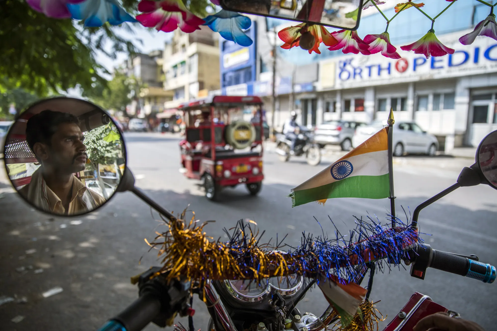 “我买了这个新的,”他说,指着一辆装饰着纸花和印度国旗的光亮红色车辆。