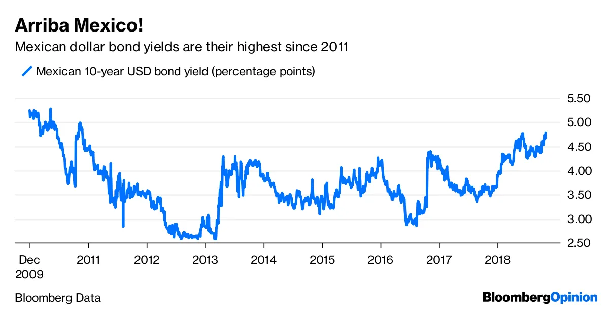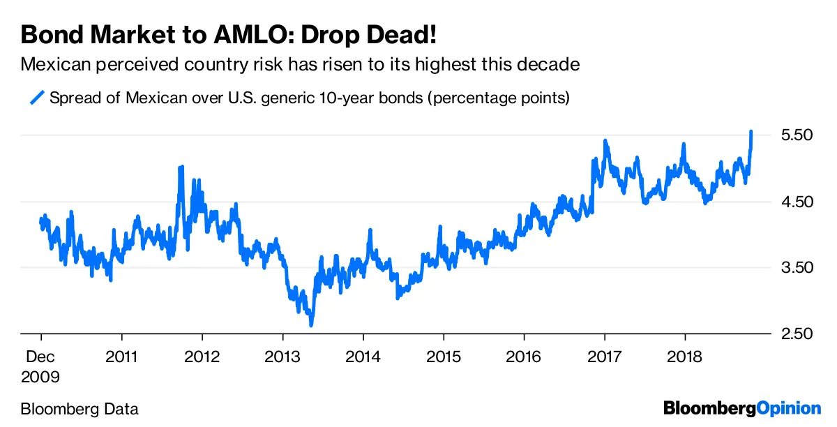 墨西哥当选总统安德烈斯·曼努埃尔·洛佩斯·奥夫拉多尔(AMLO)宣布将 取消在特斯科科谷为墨西哥城计划建设的新机场,这并不是市场想要听到的消息。 已经有很多资金投入 到机场项目中,该项目已在国际上发行债券以融资建设。对此,债券交易员将墨西哥政府债券的收益率推高至本十年来相对于美国国债的最高水平。