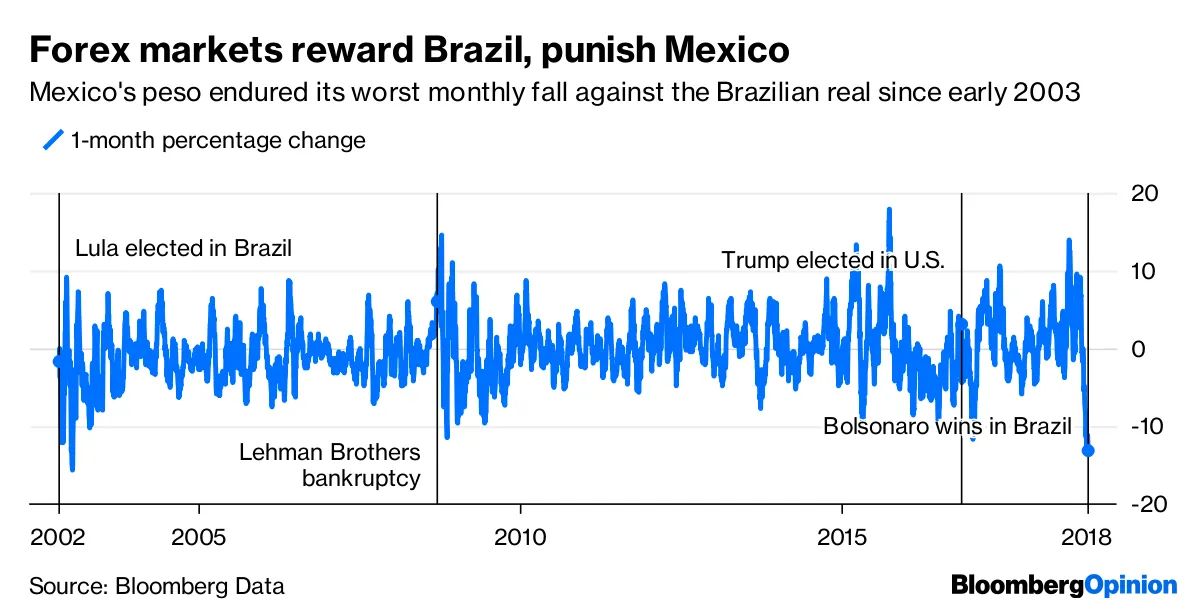 彭博数据一般来说,对一个国家政治的任何明确市场判断在一两年内都可能被逆转。任何判断也可能对这两个国家资产价格产生极大的影响。在巴西,投资者已经说服自己贾尔·博索纳罗将成为一个市场友好的总统,尽管(与AMLO不同)他似乎对经济没有太大兴趣,并提出了一系列激进的、甚至是残酷的措施来应对巴西的高犯罪率。与AMLO不同,他作为管理者尚未得到验证,从未处理过像管理墨西哥城这样困难的事情。