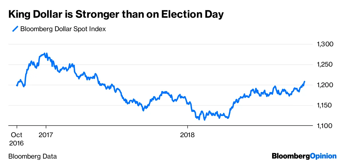 彭博数据与此同时,美元在彭博美元现货指数的基础上突破了其主要贸易伙伴。现在是自2017年5月以来最强劲的,并且自去年6月以来首次强于唐纳德·特朗普当选美国总统的那一天。我们可以预期这将增加围绕贸易和美联储利率政策的政治压力,特别是如果特朗普的共和党在下周的中期选举中遭遇挫折。