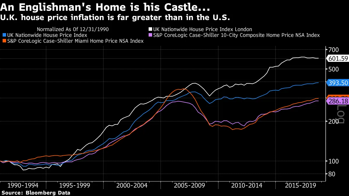 关于房地产市场还有一个引人入胜的争论。为什么它在英国的上涨方式在其他地方并不存在。英格兰银行首席经济学家安迪·哈德恩两年前引起了广泛关注,他表示房子“就像养老金”: “它应该是养老金,但几乎肯定是房地产……只要我们继续在这个国家没有建造出我们所需的房屋数量……我们将看到我们在过去一代人中所经历的,房价不断上涨。”