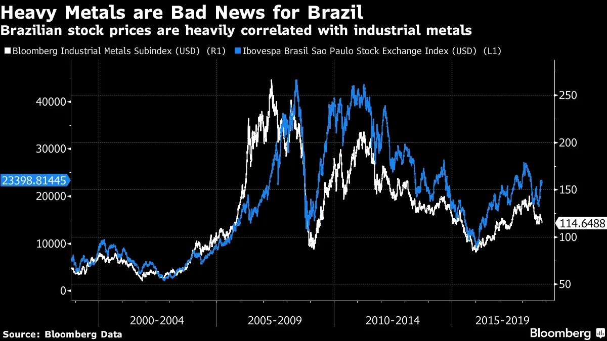 另一个不信任巴西股票反弹的理由:金属价格没有任何动静。这是一个问题,因为巴西股票几十年来一直被定价为巴西就像 一个非常大的矿。巴西经济还有很多其他方面,但基准的Bovespa股票指数与彭博工业金属指数之间的关系一直保持着惊人的强劲。如果一个上升,另一个要么跟随,要么反弹很快结束。