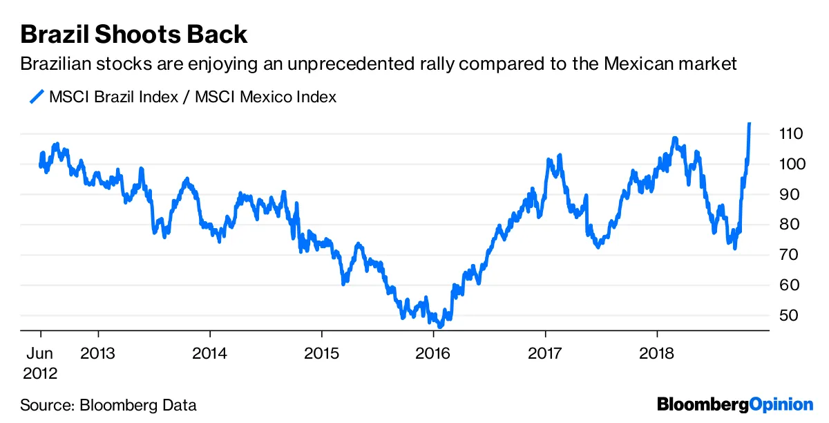 这令人震惊,且在很大程度上是应得的,但我怀疑这可能被夸大了。特别是,似乎我们已经处于XP Investments所描述的“宣泄”阶段。市场往往对拉丁美洲的政治事件反应过度,正如我本周早些时候所写的那样,墨西哥和巴西的金融资产往往受到“拉锯战”的影响。对一个国家的好消息意味着另一个国家的资金被撤出。随着两个国家同时发生重大政治事件,上周出现了历史性的波动。自2012年6月现任总统恩里克·佩尼亚·涅托当选以来,墨西哥股票一直处于领先地位。现在这种情况发生了逆转,MSCI巴西指数在六周内超越了其墨西哥同行57%。