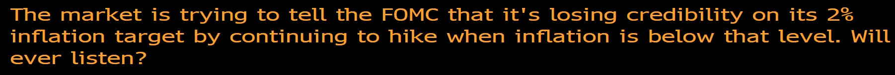 除了工资,通胀的另一个关键组成部分是对通胀的预期。理论上,人们越是预期通胀加速,发生的可能性就越大。这就是为什么美联储始终担心确保通胀预期保持“良好锚定”。通过常规固定利率债券和与通胀挂钩的证券之间的收益率差异,债券市场提供了交易者认为通胀走向的明确计算。预期通胀是为了使两种债券的回报在长期内达到盈亏平衡所需的任何水平。这很有趣,因为通胀盈亏平衡率正在急剧下降。10年期盈亏平衡率是自1月以来的最低水平,几乎降到了2%的水平,这非常重要,因为这是美联储的通胀目标。如此明确的走势意味着债券交易者并不担心通胀,因此美联储不应该为了遏制通胀而提高利率。我的同事雅各布·博恩,彭博新闻的国债通胀保护证券(TIPS)市场专家,上周发出了这个警告: