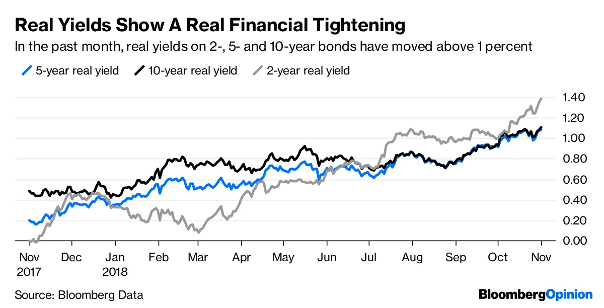 最佳相关性与零售汽油价格有关,后者是消费者价格指数的一部分,而不是与原油有关。从长期来看,通货膨胀预期与汽油价格的变动相关性约为0.7。这是显著的,因为1的读数意味着它们同步移动。然而,尽管石油的变动推动了最近盈亏平衡点的大幅下降,但并不能解释所有的下降。博恩的解释是市场在告诉美联储担心通货膨胀是错误的,因此似乎是合理的。让我展示另一种盈亏平衡点变动的重要性。衡量金融条件紧张程度的最佳指标之一是长期实际收益率,即考虑通货膨胀后的债券收益率。最近通货膨胀预期的下降与债券收益率的上升结合,创造了自金融危机以来最高的实际收益率。这是过去12个月中两年、五年和10年实际收益率的变动情况: