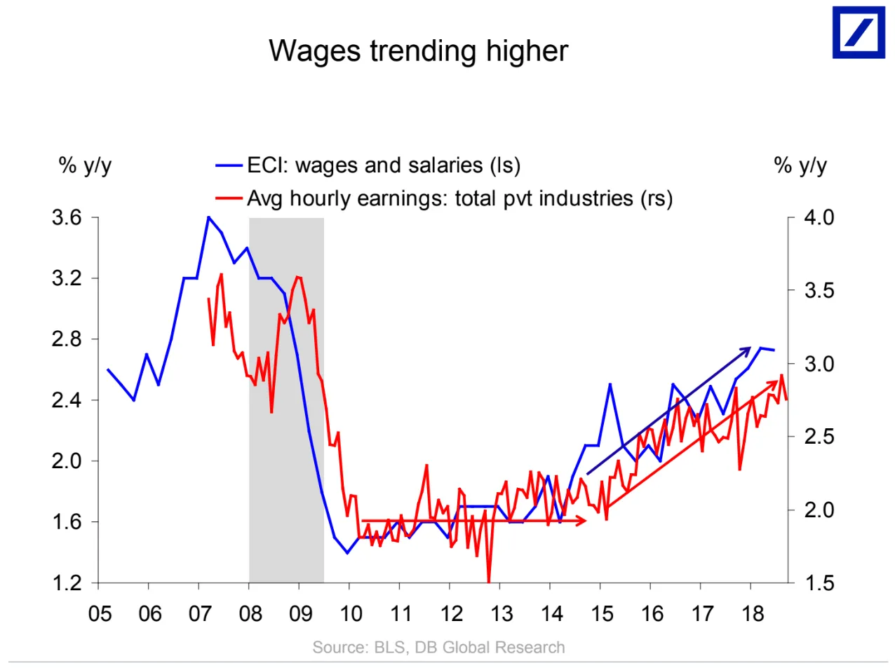 星期五是美国的就业日。像往常一样,非农就业报告将引发兴奋,因为这将是重要数据发布的最后机会之一,这可能会劝阻联邦储备在12月第四次加息。但是,唉,这不太可能。正如过去一年 – 甚至更长时间 – 所证明的,就业数据 本身 并不是那么重要。劳动力市场强劲,雇主填补职位空缺变得越来越困难。问题是这是否最终会转化为通货膨胀压力,正如 菲利普斯曲线关系 所暗示的那样。这意味着平均时薪将受到最多关注。自金融危机以来,这一指标的年增长率没有超过3%。但是,正如德意志银行首席美国经济学家托尔斯滕·斯洛克的这张便捷图表所表明的,趋势正朝着这个方向发展: