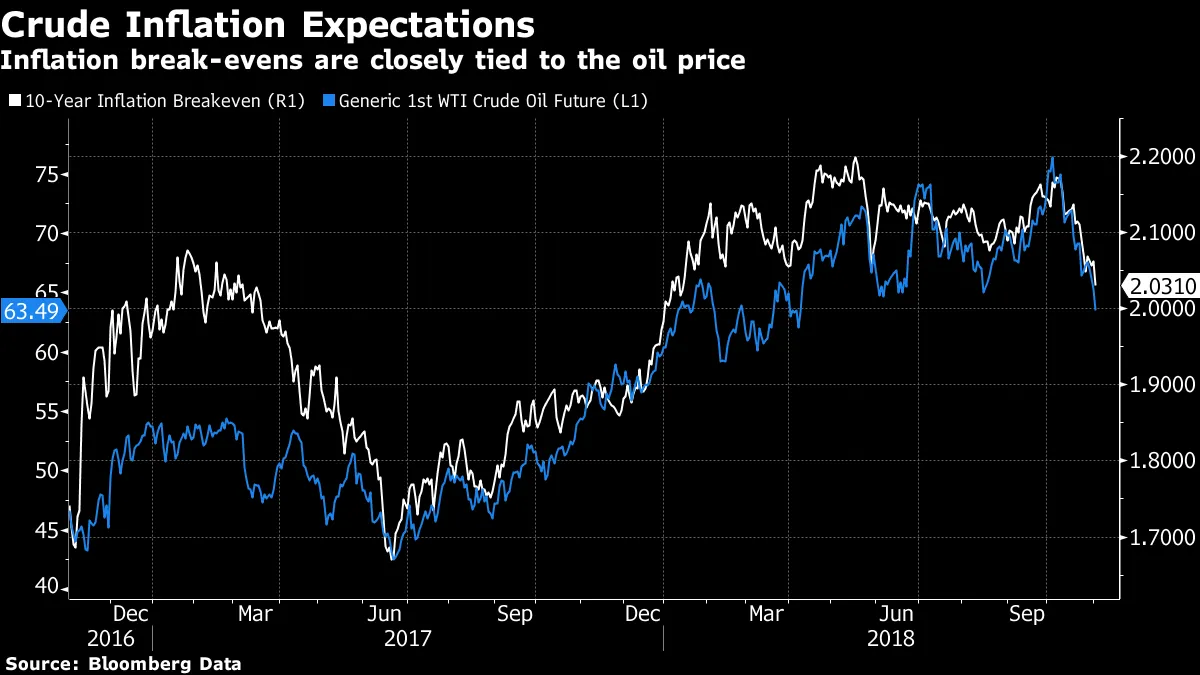 然而,有一点警告是必要的。通胀盈亏平衡率往往受油价驱动。西德克萨斯中质原油在过去一个月内急剧下跌——通胀盈亏平衡率也是如此。