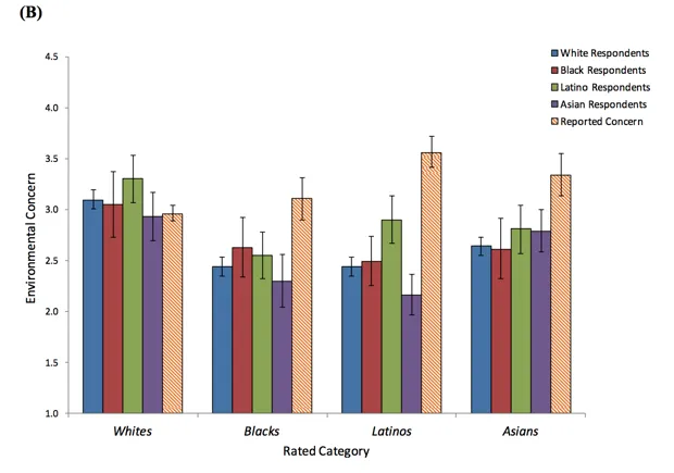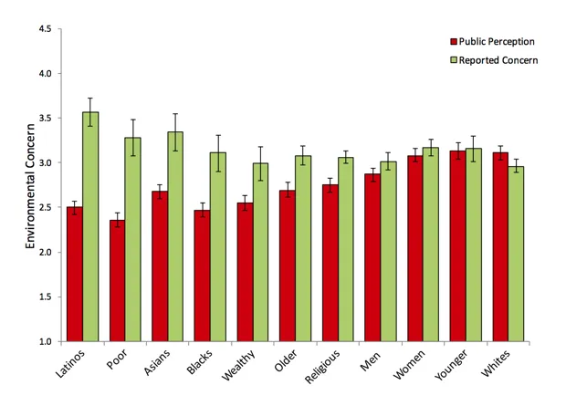彭博社城市实验室芝加哥以冷静、派对和阳光克服DNC怀疑者纳粹掩体的绿意改造将丑陋的过去变成城市的眼球吸引器圣保罗的贫民窟如何帮助庇护南美洲最大的城市仅使用公共交通的跨洲竞赛当研究人员询问他们是否认为自己是环保主义者时,大约三分之二的拉丁裔和亚裔受访者表示肯定,而只有一半的白人受访者如此。(只有三分之一的黑人受访者将自己与这个词联系在一起。)然而,当被要求评估其他群体时,参与者对所有人口统计群体的关注程度都严重低估,除了白人、女性和年轻美国人。比如,公众对拉丁裔的关注度普遍认为在2.5左右,而受访者对白人的关注度评分则在3以上。