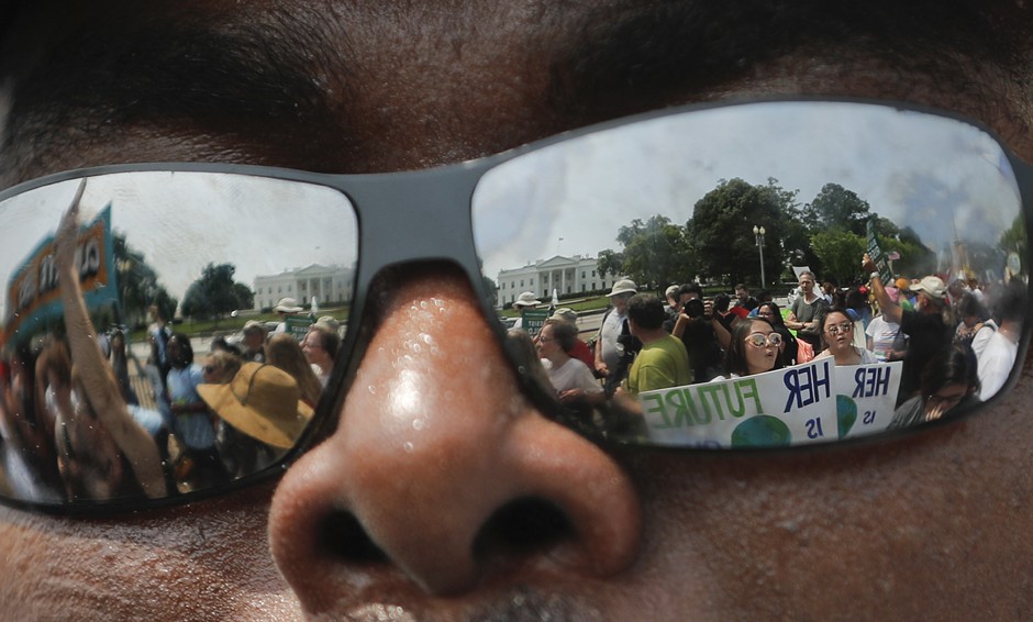 在2017年华盛顿特区的气候游行中,拉丁裔倡导组织CASA de Maryland的成员帕特里克的太阳镜中映射出游行者的身影。巴勃罗·马丁内斯·蒙西瓦伊斯/AP想象一下一个环保主义者。