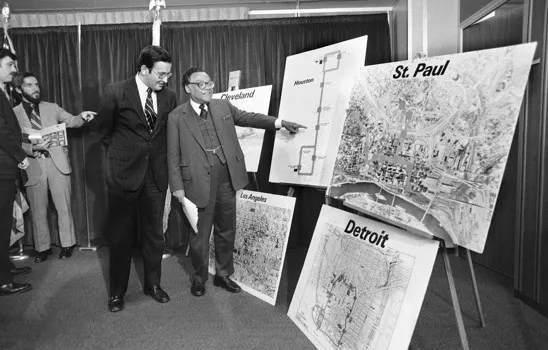 联邦交通官员在1976年查看五个城市的图表,这些城市被选中进行全国性项目,以评估自动化市中心人民移动器系统的好处。哈维·乔治/AP人民移动器的原始计划——源于1970年代联邦对未来城市交通形式的短暂热情——曾设想将其延伸到市中心核心之外,但政治、资金和人口统计似乎从未对齐。当系统在1987年实际开放时,经历了成本增加和施工延误,底特律的人口已经在急剧下降,而它所环绕的市中心也已空心化。对于许多当地人来说,新奇感很快就消退了。过去十年,年乘客量一直徘徊在两百万左右,远低于规划者的预期。在2016年,人民移动器的每次乘坐成本高达7.47美元,底特律交通部门的年运营成本为1800万美元,由市、州和联邦政府共同承担。(相比之下:使用量更大的迈阿密地铁移动器在2010年每次乘坐成本为2.56美元。)