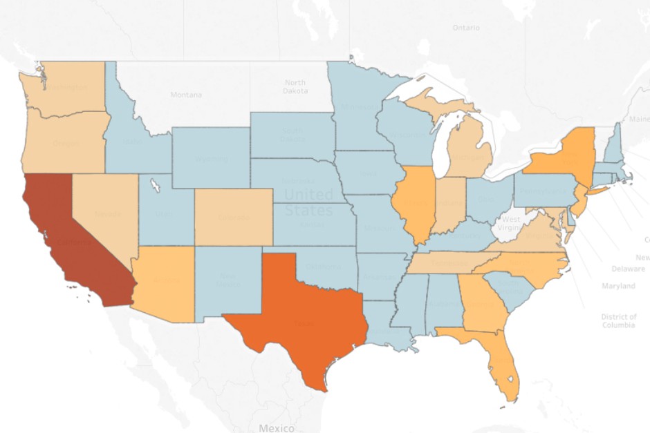彭博社城市实验室芝加哥以冷静、派对和阳光克服了民主党全国委员会的怀疑者纳粹掩体的绿意改造将丑陋的过去变成城市的眼球吸引者圣保罗的贫民区如何帮助庇护南美洲最大的城市仅使用公共交通的跨洲竞赛将鼠标悬停在下面的地图上,查看这些孩子的居住地:受影响儿童少于40,000的州为蓝色;受影响儿童较多的州为渐变橙色。加利福尼亚州占全国受影响儿童总数的四分之一以上;德克萨斯州、纽约州、佛罗里达州和伊利诺伊州也很突出。