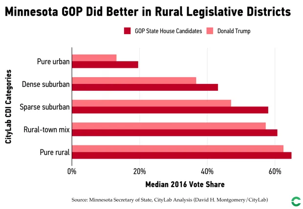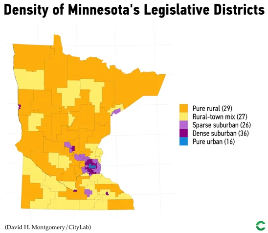 为了理解这一点,CityLab将其国会密度指数应用于一个战场州明尼苏达州的州立法竞选,在那里共和党正在捍卫州众议院的11个席位的多数——这一防御主要在郊区地区进行。