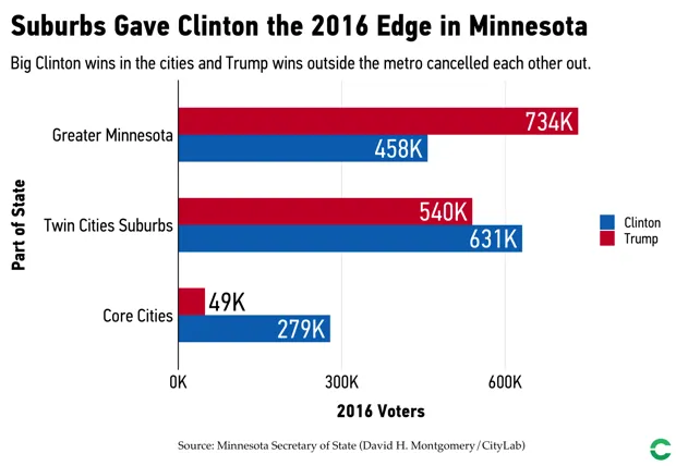 州级候选人,包括州长、美国参议院、检察总长和其他竞选者,也在郊区积极拉票,因为那里的选民规模庞大且分歧明显。在2016年,希拉里·克林顿在明尼阿波利斯和圣保罗的领先优势被大都市外的同样巨大差距所抵消。她之所以赢得该州,是因为她在郊区勉强取得了胜利。