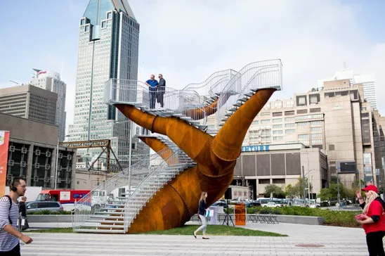 公园的另一端是树突,这是蒙特利尔艺术家米歇尔·德·布罗因创作的雕塑。两根扭曲的金属树干从人行道中突出来,邀请路人爬上楼梯,俯瞰博纳文图尔高速公路和城市本身。