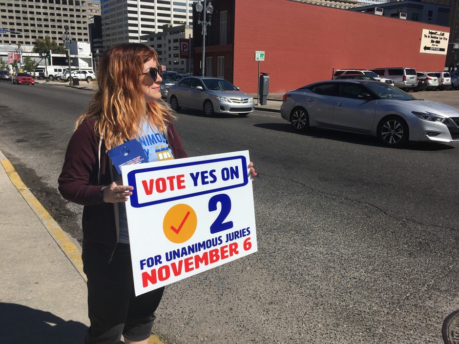新奥尔良居民莫莉·埃泽尔举着一块标语,宣传将要求在严重重罪案件中达成一致陪审团裁决的路易斯安那州宪法修正案。该修正案在周二投票通过。凯文·麦吉尔/AP路易斯安那州的许多地区检察官 反对本周的修正案2投票,因为这将要求刑事审判中陪审团的一致同意。检察官现在只需12名陪审员中的10或11名就能定罪,这在除俄勒冈州外的其他州的律师中是奢侈的。然而,在本周投票前, 路易斯安那地区检察官协会(LDAA)并没有试图影响选民对修正案2的看法,因为该协会 在没有成员一致同意的情况下不对问题发表公开立场。这意味着LDAA在决定政治时对自己要求的标准高于许多成员在陪审团决定中对人们实际生命悬于一线时的标准。