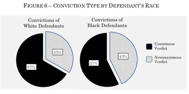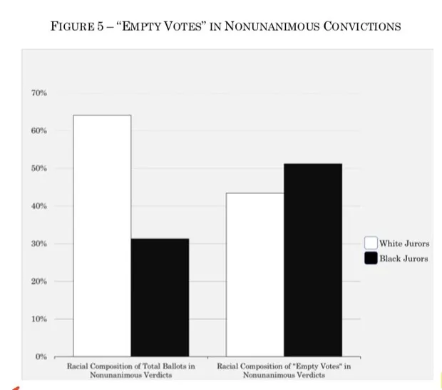 下面的图表来自Frampton的研究,显示了非一致性裁决政策如何基本上使这些案件中黑人陪审员的投票沉默: