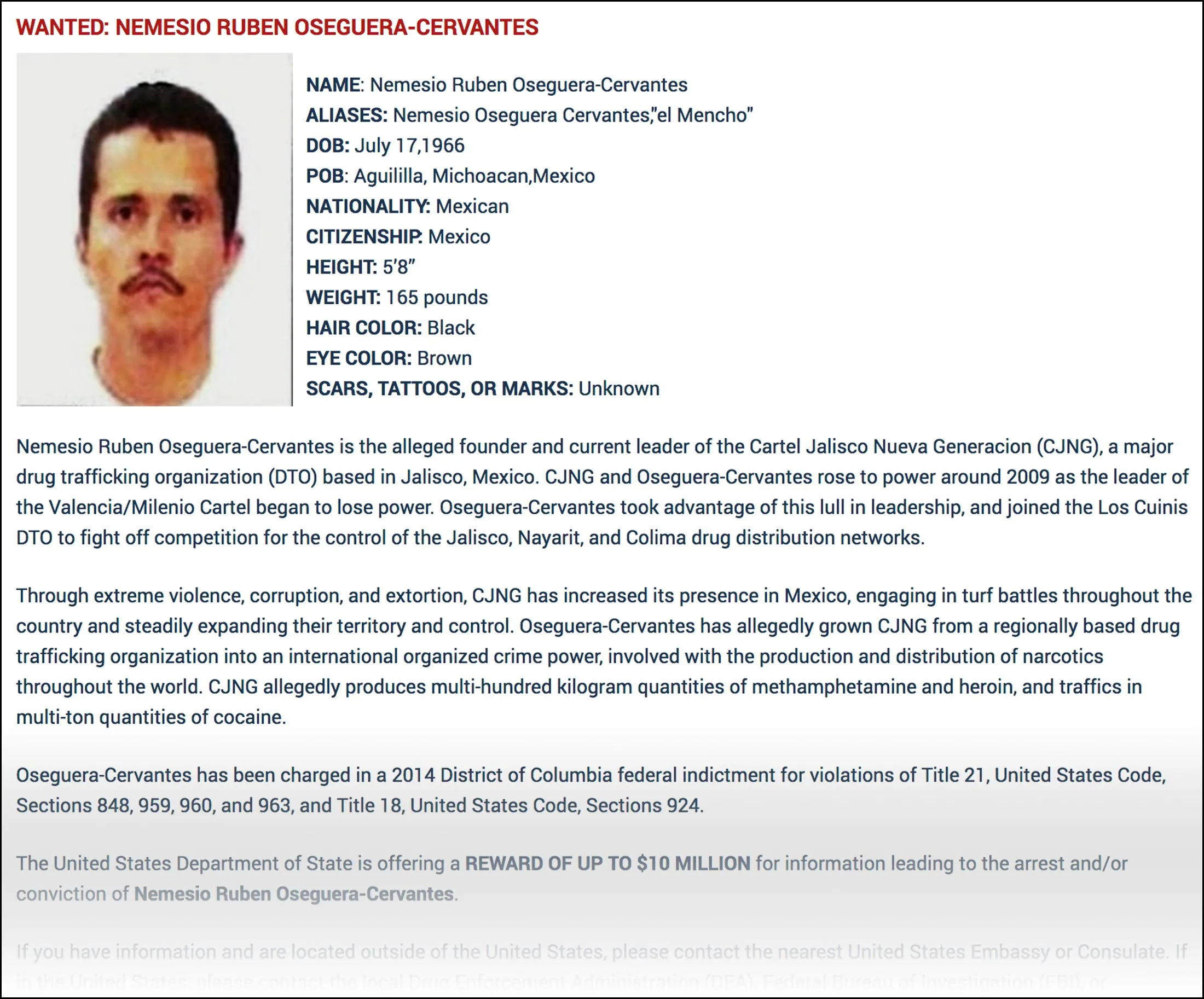 来源:美国国务院上个月,特朗普政府再次将NRP推向了聚光灯下,当时(现已卸任的)美国司法部长杰夫·塞申斯宣布对 内梅西奥·奥塞赫拉·塞万提斯 的悬赏金额已翻倍,达到1000万美元。52岁的塞万提斯被认为是哈利斯科新一代贩毒集团的领导人。美国国务院表示,该集团“负责将大量可卡因、甲基苯丙胺和掺有芬太尼的海洛因走私到美国”。