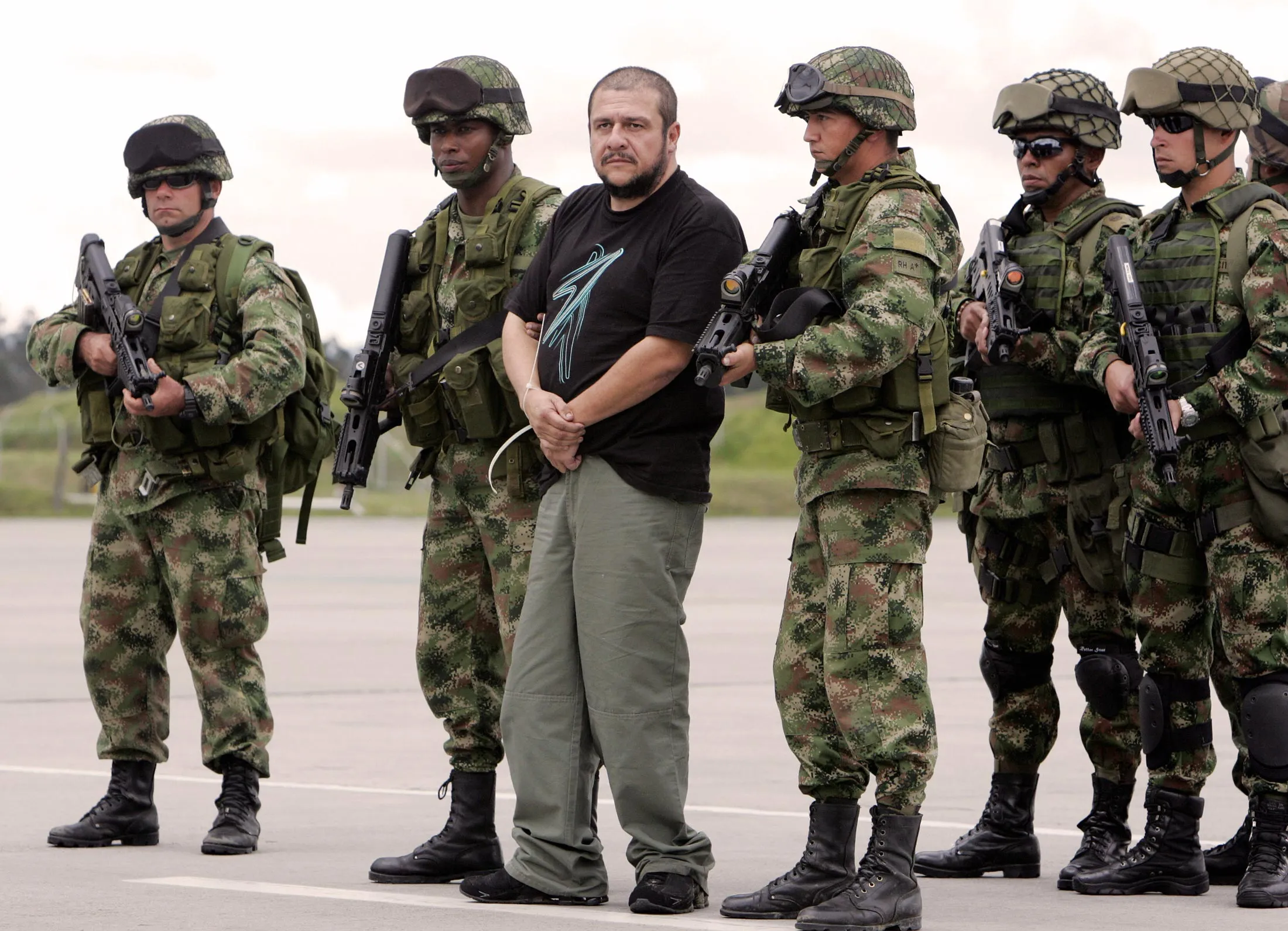 被定罪的毒品大亨迭戈·莱昂·蒙托亚·桑切斯,中央,2007年在哥伦比亚士兵的拘留下。