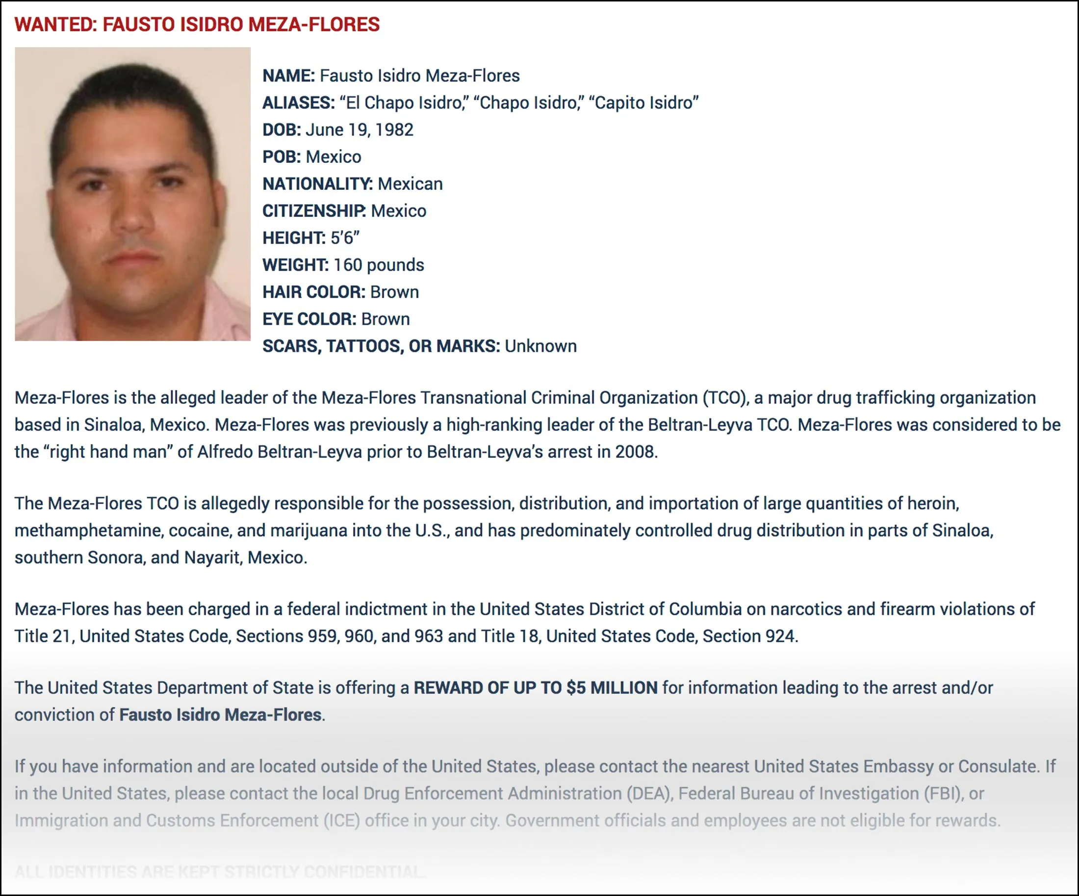 其中一个人是法乌斯托·伊西德罗·梅萨-弗洛雷斯。以“埃尔·查波·伊西德罗”这个绰号而闻名,他被 FBI描述为一个总部位于墨西哥锡那罗亚的主要毒品贩运组织的头目。根据政府的说法,那里有 几个毒品帮派,其中一些构成了被称为 锡那罗亚卡特尔的组织。(梅萨-弗洛雷斯不应与另一位更著名的 埃尔·查波混淆,后者是目前在纽约布鲁克林联邦法院受审的国家奖励计划校友。那位埃尔·查波在墨西哥的 合作伙伴也在国家奖励计划名单上。)