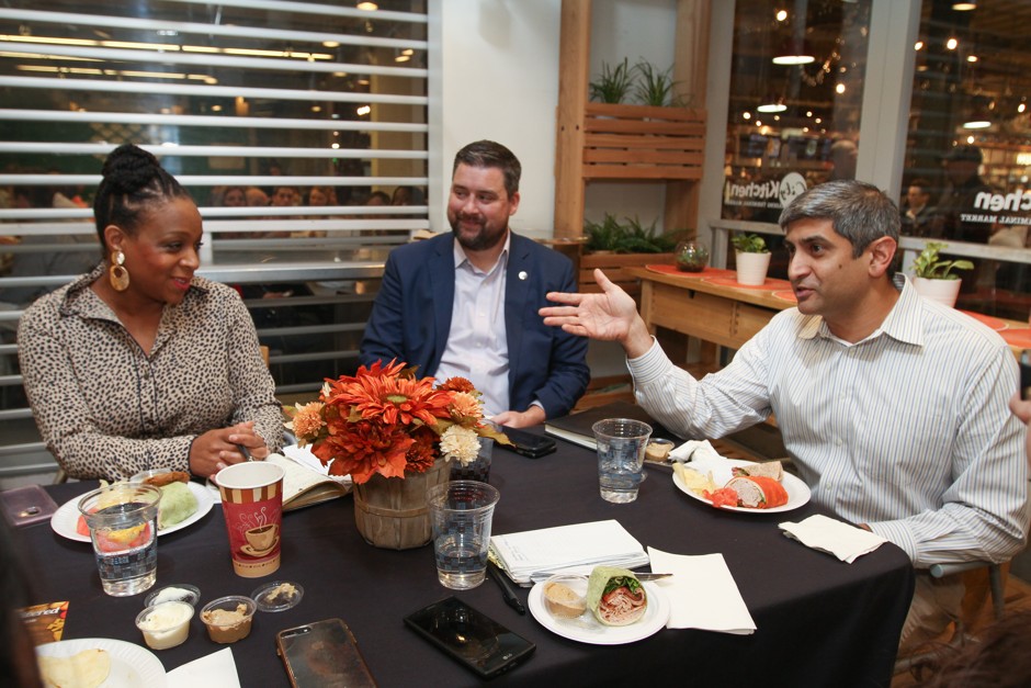 在听到城市的图书馆将其分支重新品牌为“社区图书馆”,以强调其作为当地设施的角色后,古普塔手里拿着薯片传达了一个建议。“你必须让人们知道你重视什么,以消除任何误解,”他对桌子上的人说。“我不得不拼命反对‘美食广场’这个词,因为这不是我们的本质。我们不是某个高档美食广场——我们是一个公共市场。”