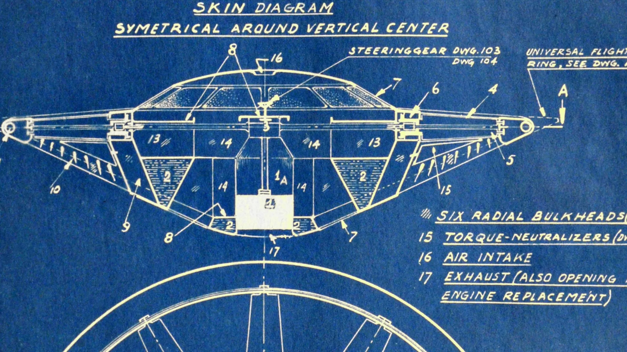 他从一个包里拿出一张海报,摊开在我的桌子上。那是一幅复杂的图画,描绘了一种看起来更圆形的 千年隼 来自 星球大战 的飞行器。这个盘状飞行器的设计是垂直起飞,利用空气喷射。在飞行中,空气可以通过一系列倾斜位置的百叶窗向前或向后引导,所有的操控都在一个中央驾驶舱内完成。