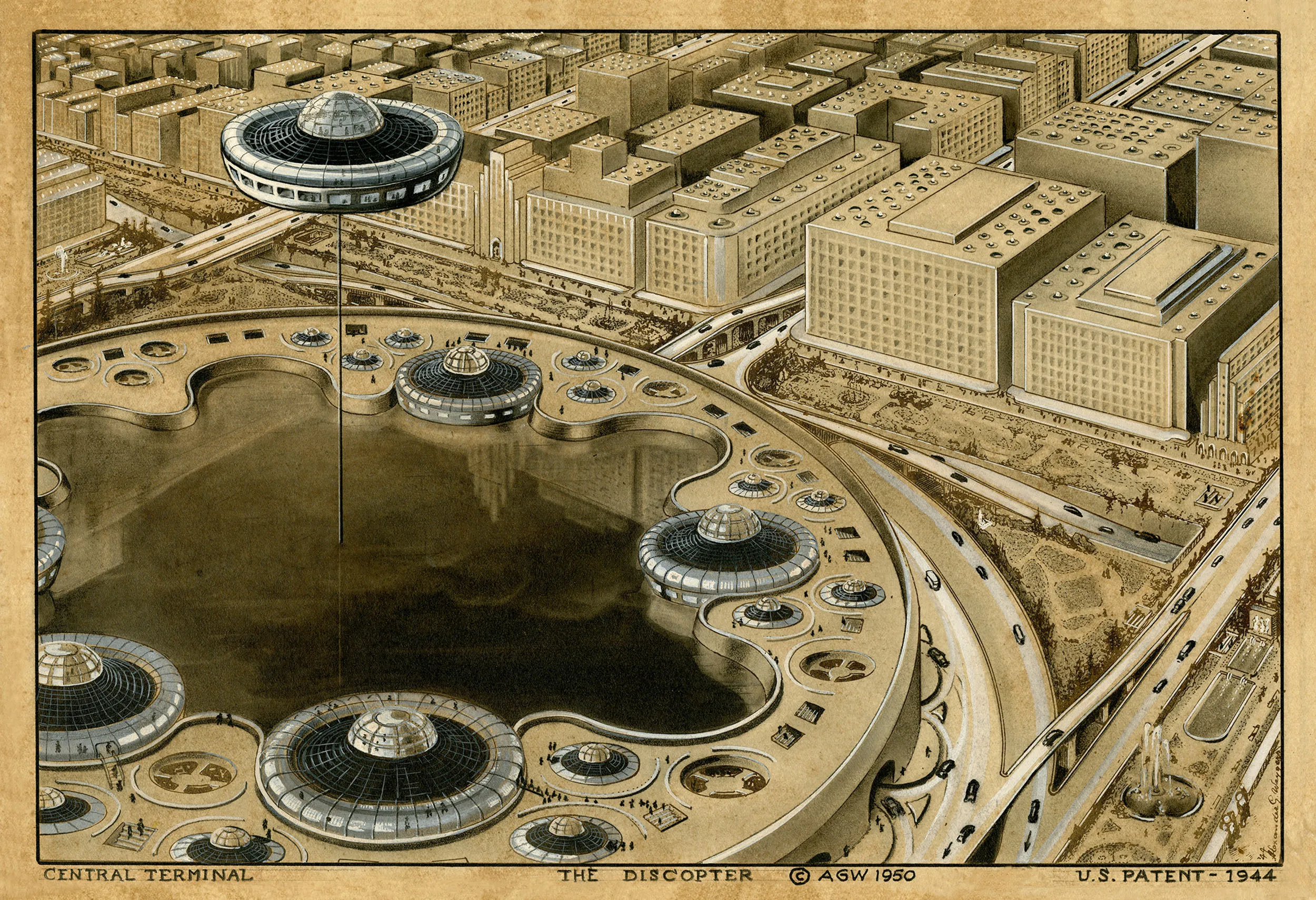 有更多关于飞碟的绘画——还有很多。这个想法最早在1927年出现在韦格斯的脑海中;从一开始,他就设想这台机器将改变城市。亨特的下一个展览,一幅描绘1985年旧金山未来模样的画作,展示了巨大的跨洋飞碟,能够容纳数百名乘客,停靠在海湾沿岸的码头。较小的通勤模型,停靠在办公楼旁,能够分离出类似汽车的交通工具在城里移动。这些飞行器内部的绘画极为华丽,展示了从网球场和卧铺到小三明治上那一片奶酪的所有细节。