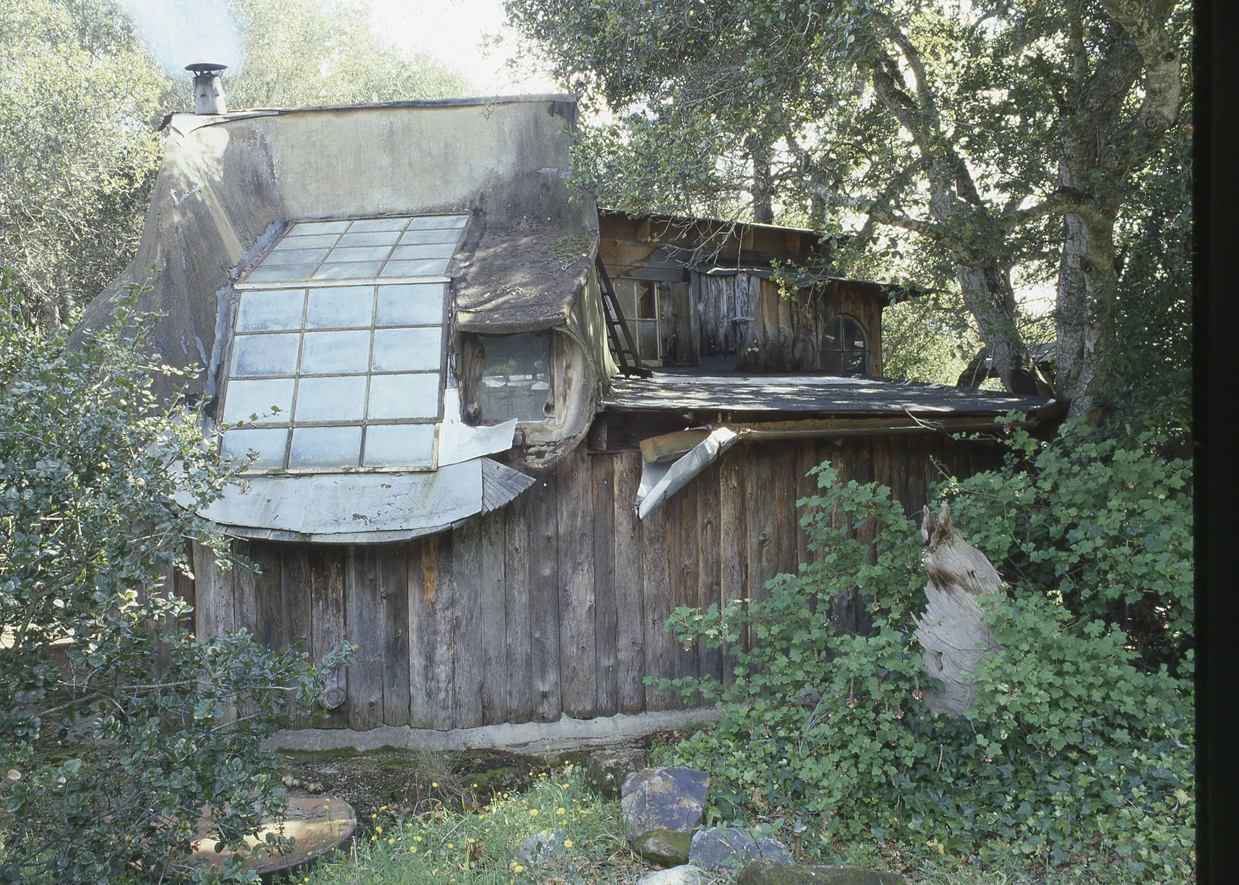 最终,韦格斯开始建造一座将成为标志性的房子。他在垃圾场寻找木头、金属、浴缸、水槽和窗框进行回收。他开始建造一个看起来像蘑菇帽的结构——卡梅尔谷中的霍比特人巢穴。它是圆形的,侧面弯曲。韦格斯形容它为“疯狂的几何穹顶”。他所需的每一个铰链、把手、螺母和螺栓都是手工锻造的。他决定将结疤的木材外观保持未完成状态,以与周围的景观相匹配。一个厚实的平顶覆盖着这个结构,苔藓在边缘生根。最终的产品与周围环境融为一体,几乎看起来就像森林本身产生的。