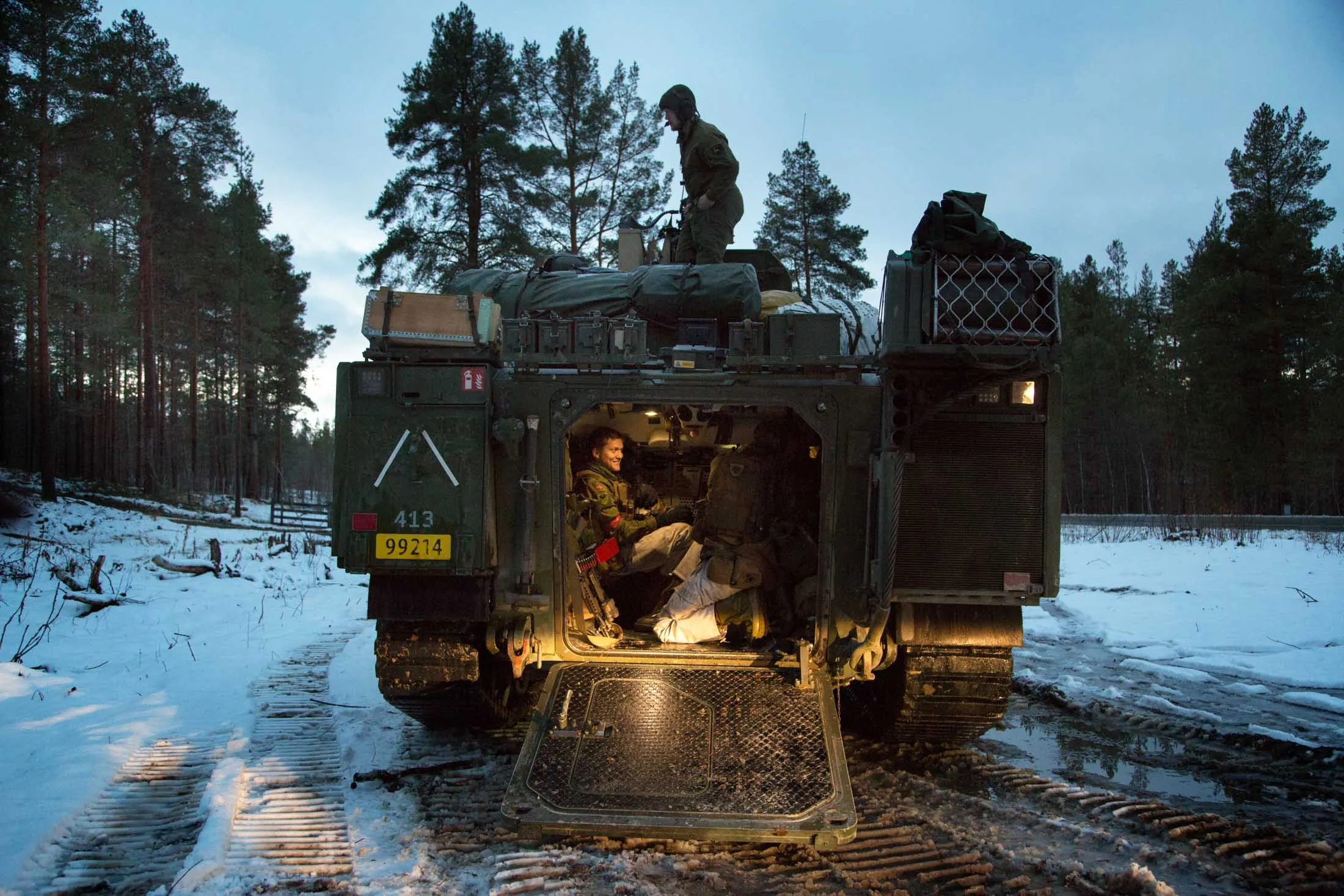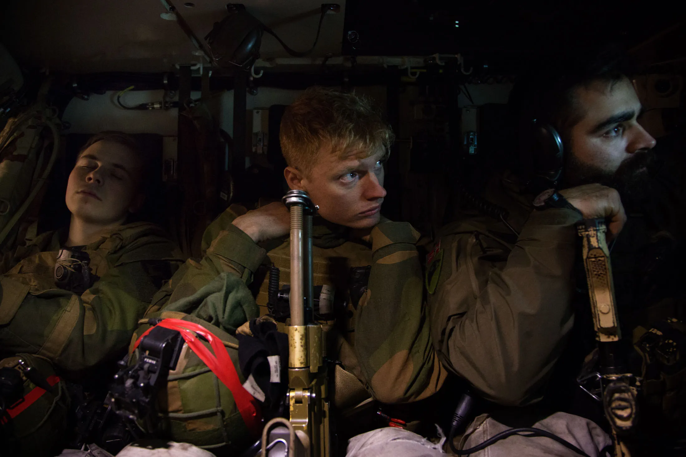 挪威北方旅装甲营的执行官彼得·巴克约德;来自德国装甲部队的士兵赫尔曼·施瓦布;美国海军陆战队的乔丹·科克伦少校。摄影师:Loulou d’Aki 为彭博社拍摄一辆瑞典制造的CV9030运输车的内部可以容纳12名士兵,膝盖在过道上碰撞。坐在我们车辆后面的一个留着胡子的队长查看了他的显示屏。屏幕上显示着来自七个夜视摄像头的画面,这些摄像头位于车辆的各个侧面。它们被指挥官使用,指挥官占据着旋转炮塔内的一个小空间,而司机则坐在前面一个像吸尘器箱子大小的洞里。