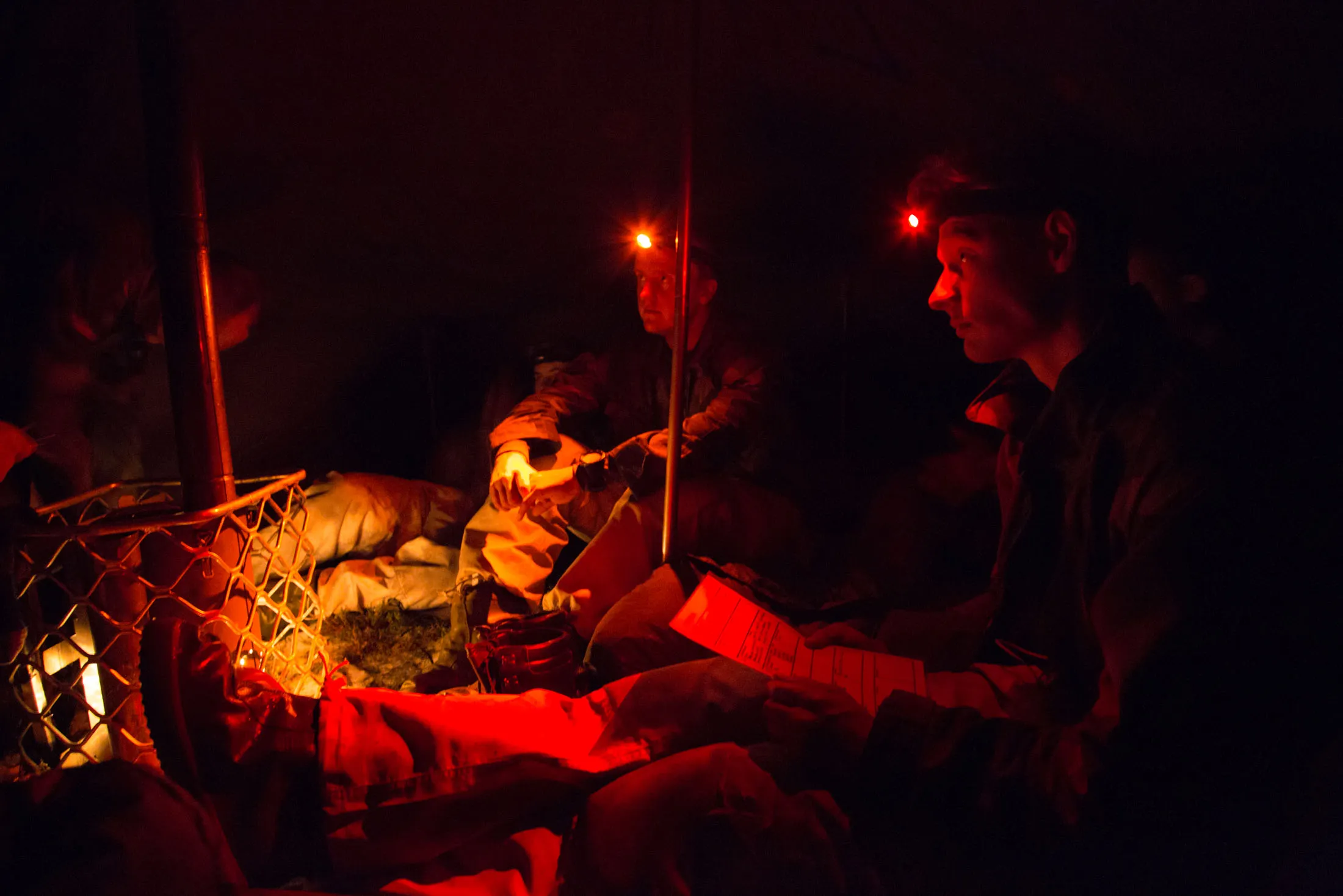 大约凌晨4点,他们停下来扎营。帐篷在覆盖着雪的蓝莓灌木和驯鹿苔藓的隆起地面上搭建。士兵们轮流睡觉,气温降到23华氏度(-5摄氏度)。到中午时分,所有人都醒来,他们得知敌方车辆在夜间经过了他们附近。如果他们的营地被发现,所有人都必须从帐篷里出来并排队。然后一名敌方军士会数他们,宣称他们全部阵亡。
